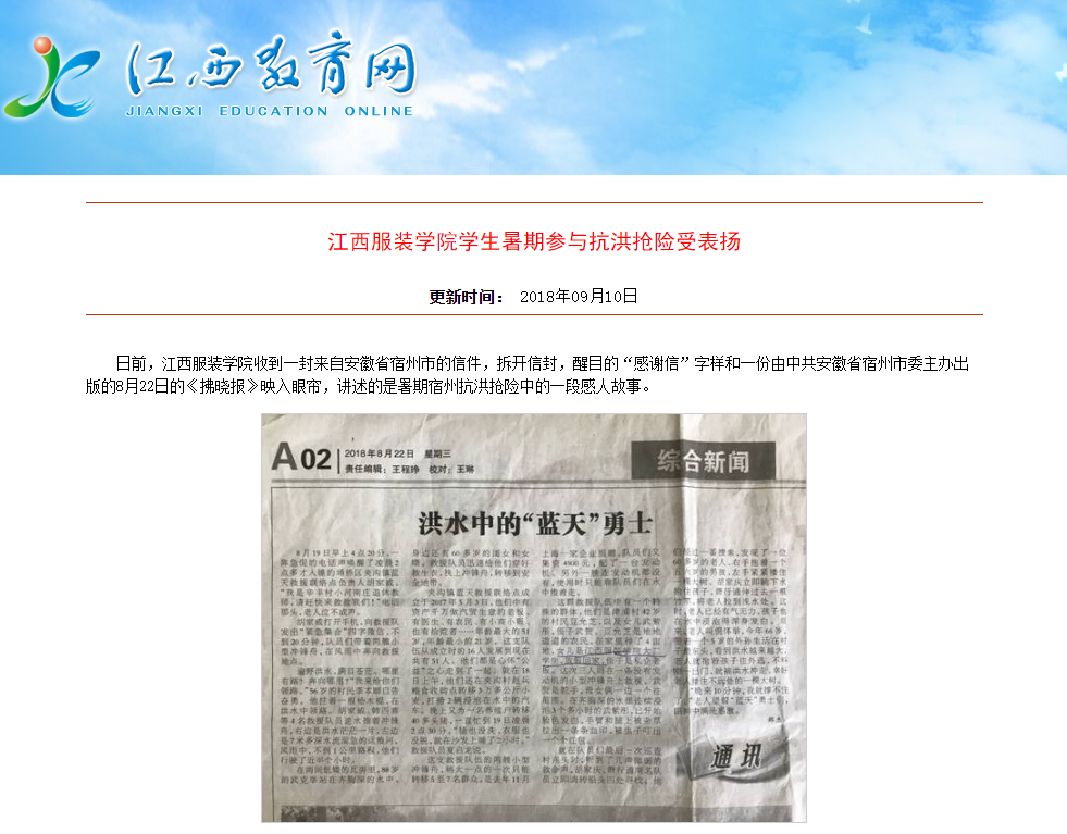 今年8月19日,宿州市夹沟镇新丰村发生特大洪涝灾害,正在家乡度暑假的江西服装学院服装设计学院2017级时装3班同学武紫彤跟随妈妈窦允芝来到受灾地区,加入到一支由志愿者组成的蓝天救援队,参加到抗洪救灾中,跟随冲锋舟挨家挨户搜寻被困的受灾群众。
