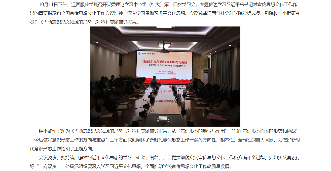 10月11日下午,江西服装学院召开党委理论学习中心组(扩大)第十四次学习会,专题传达学习习近平总书记对宣传思想文化工作作出的重要指示和全国宣传思想文化工作会议精神,深入学习贯彻习近平文化思想。会议邀请江西省社会科学院党组成员、副院长钟小武研究员作《当前意识形态领域的形势与对策》专题辅导报告。