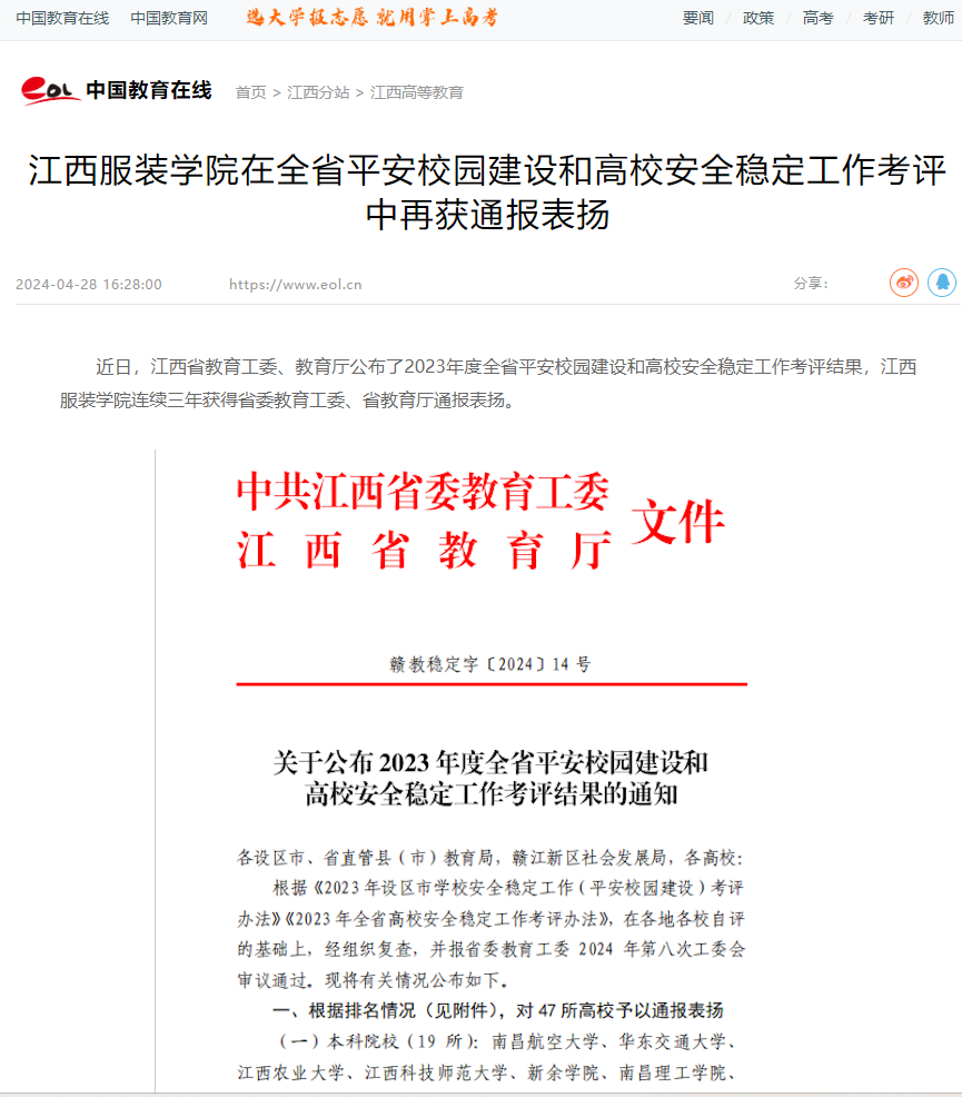 中国教育在线:江西服装学院在全省平安校园建设和高校安全稳定工作考评中再获通报表扬