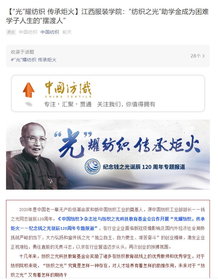 新闻链接:中国纺织:【“光”耀纺织 传承炬火】江西服装学院:“纺织之光”助学金成为困难学子人生的“摆渡人”
