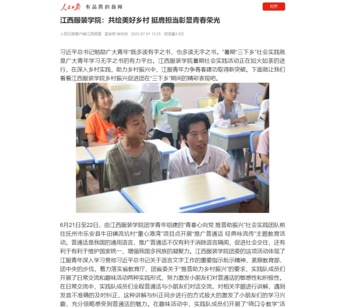 习近平总书记勉励广大青年“既多读有字之书,也多读无字之书。”暑期“三下乡”社会实践就是广大青年学习无字之书的有力平台。江西服装学院暑期社会实践活动正在如火如荼的进行,在深入乡村实践,助力乡村振兴中,江服青年力争青春建功取得新突破。下面就让我们看看江西服装学院乡村振兴促进团在“三下乡”期间的精彩表现吧。可以扫码观看原文: