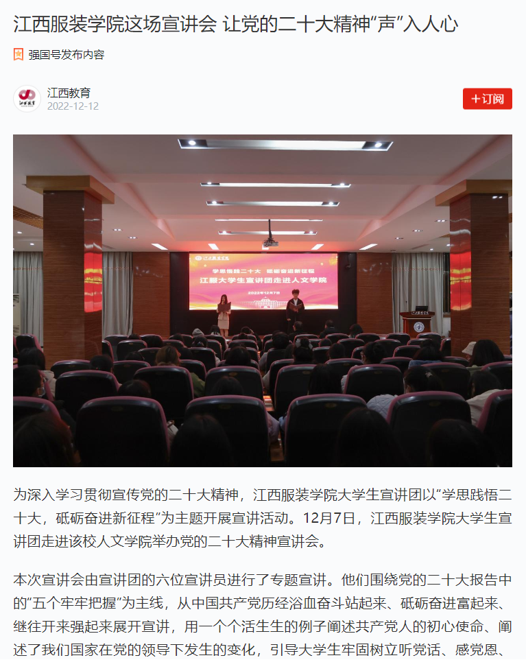 学习强国:江西服装学院这场宣讲会 让党的二十大精神“声”入人心