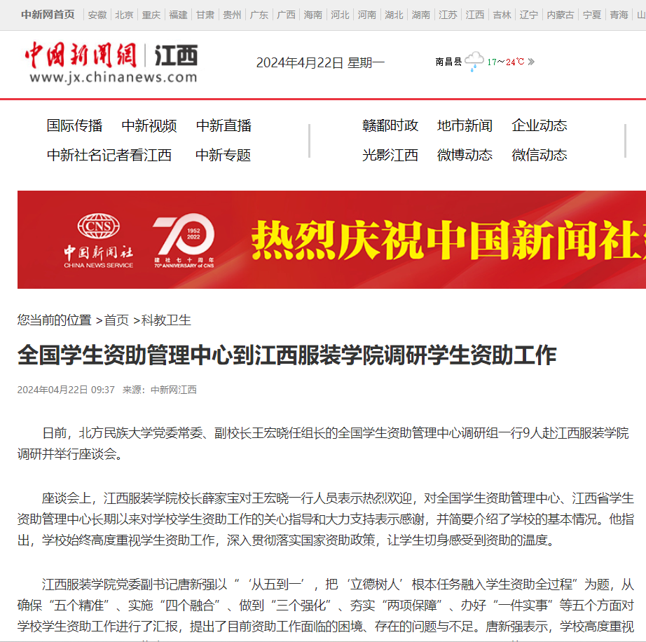 中国新闻网:全国学生资助管理中心到江西服装学院调研学生资助工作