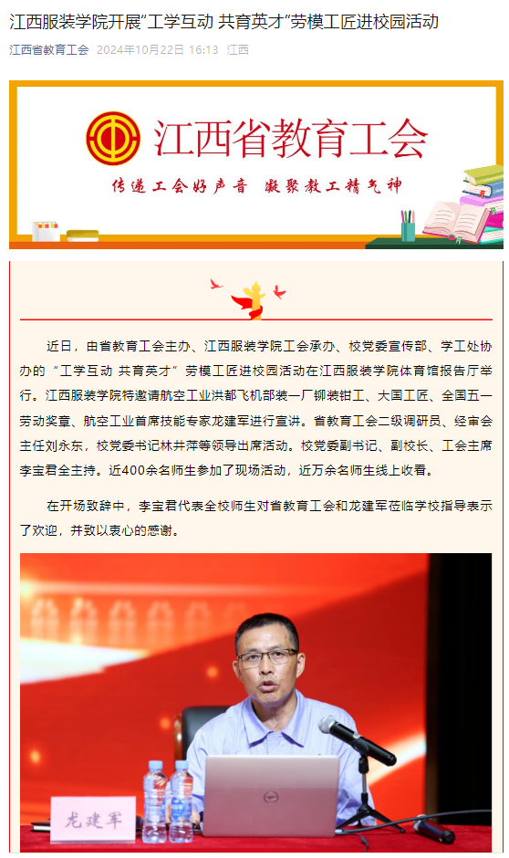 江西省教育工会:江西服装学院开展“工学互动 共育英才”劳模工匠进校园活动