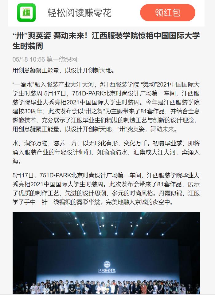 新闻链接:趣头条:“卅”爽英姿 舞动未来!江西服装学院惊艳中国国际大学生时装周