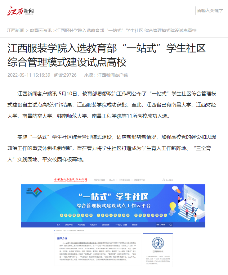 新闻链接:江西服装学院入选教育部“一站式”学生社区综合管理模式建设试点高校