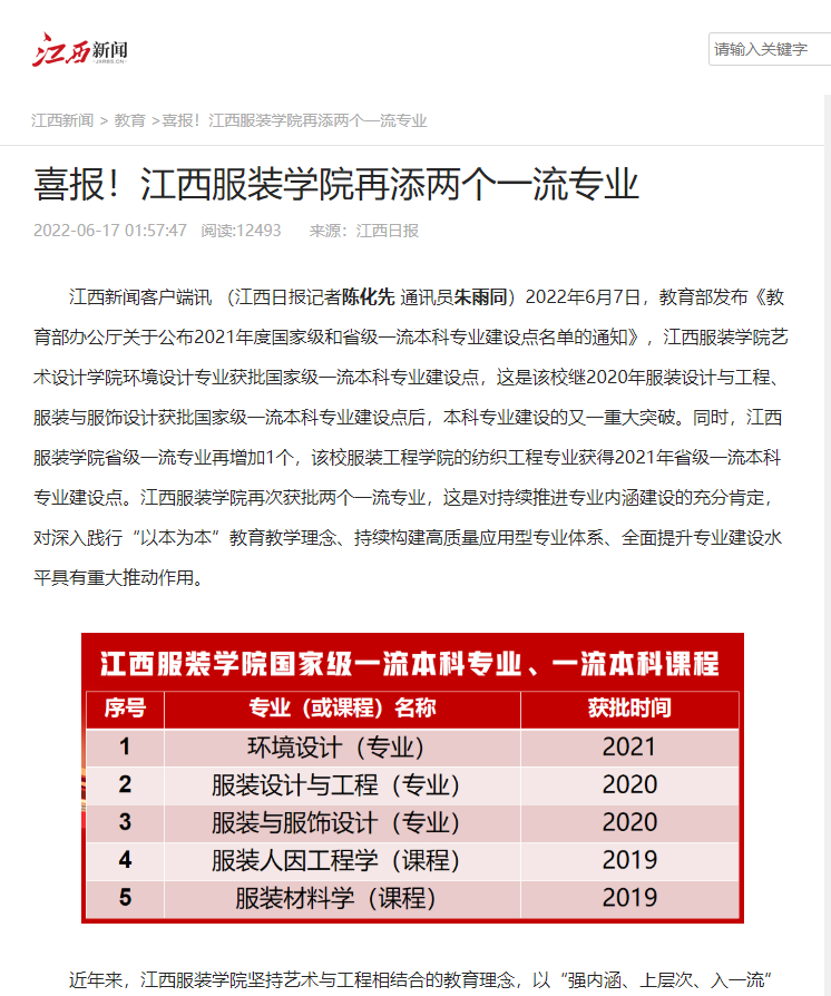 江西新闻·江西日报:喜报!江西服装学院再添两个一流专业