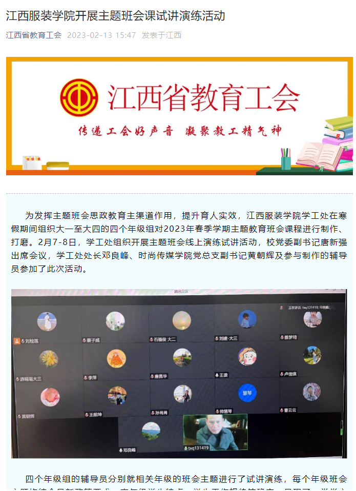 为发挥主题班会思政教育主渠道作用,提升育人实效,江西服装学院学工处在寒假期间组织大一至大四的四个年级组对2023年春季学期主题教育班会课程进行制作、打磨。2月7-8日,学工处组织开展主题班会线上演练试讲活动,校党委副书记唐新强出席会议,学工处处长邓良峰、时尚传媒学院党总支副书记黄朝辉及参与制作的辅导员参加了此次活动。