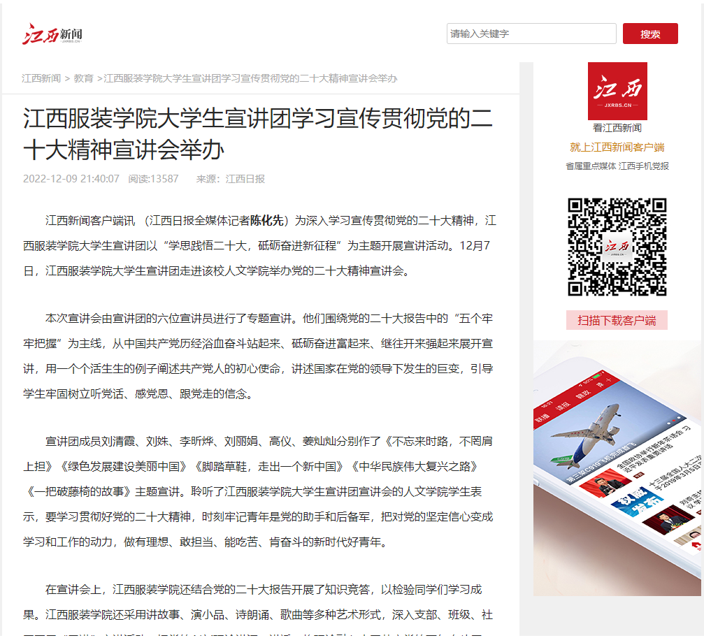 江西新闻·江西日报:江西服装学院大学生宣讲团学习宣传贯彻党的二十大精神宣讲会举办