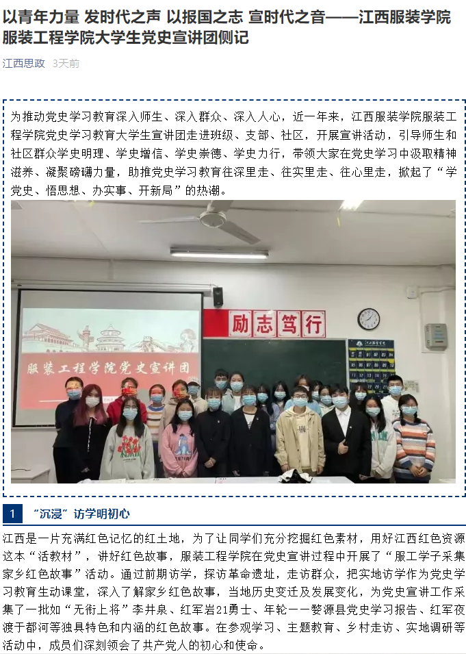 新闻链接:学习强国:讲好百年党史 争做时代新人——江西服装学院以宣讲话党史掀热潮