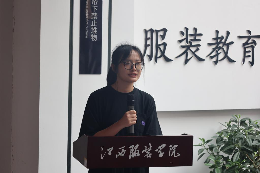 参展学生代表周欣颖同学发言介绍了创作过程中的感悟,并表达了全体参展学生对传承中华优秀传统文化的热情与承诺,展现了青年学子对艺术的深刻理解和对廉洁精神的坚定追求。
