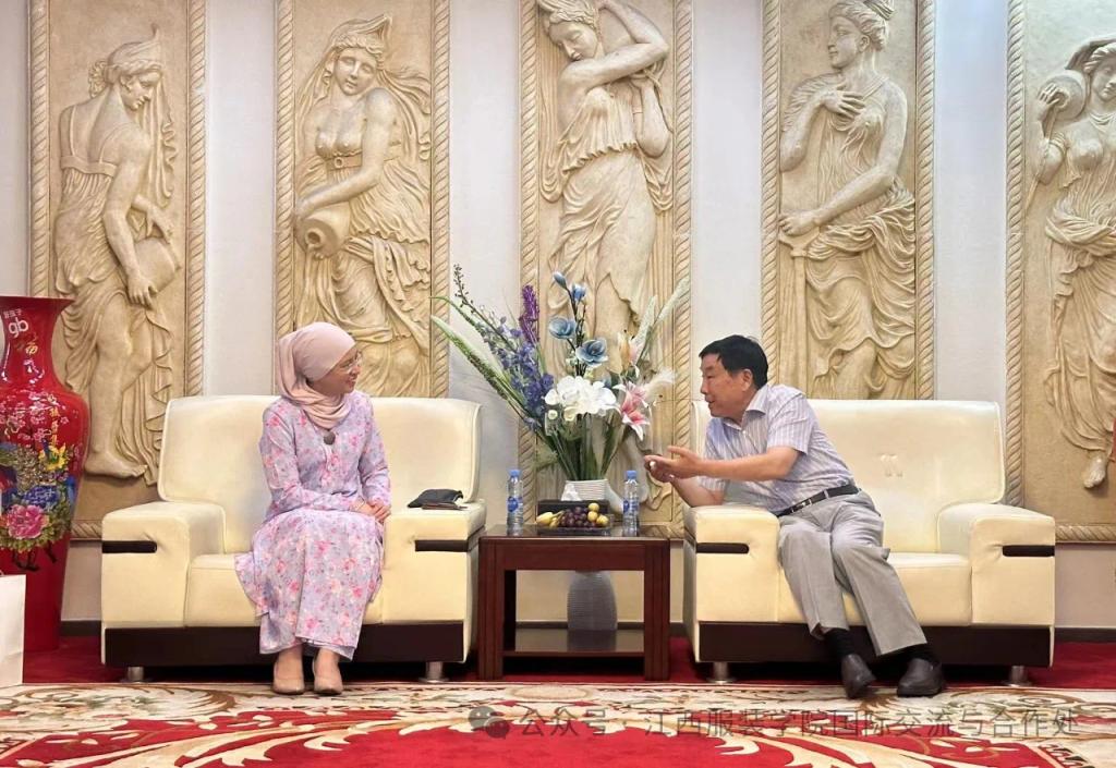 薛家宝在会面时向苏莱雅女士一行表达了最诚挚的欢迎。他详细介绍了江西服装学院的发展历程和办学特色,特别是本校与马来西亚高校的合作与交流情况以及取得的一系列成果。薛校长特别指出,学校始终致力于培养具有国际视野的人才,不断提升其全球竞争力。他表示期待通过更深层次的文化与学术交流,进一步巩固与发展同马来西亚的合作关系。