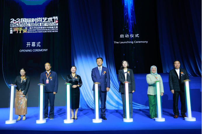 中国纺织工业联合会副会长梁鹏程、江西服装学院理事长涂燕萍、中国服装设计师协会秘书长王莹、中原工学院党委书记贾少鑫、马来西亚吉兰丹大学副校长尼克、江西服装学院党委书记林井萍、江西服装学院校长薛家宝共同为2024年江西服装学院国际时尚艺术节启幕。