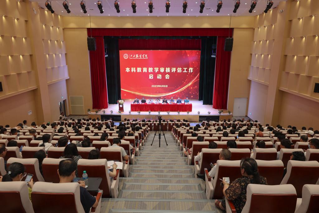 新闻中心讯(文/万强 图/万强 黄珊) 6月6日下午,江西服装学院本科教育教学审核评估动员大会在体育馆报告厅召开,对本科教育教学审核评估工作进行安排部署,动员全校上下统一思想、坚定信心、凝心聚力,全力以赴做好新一轮本科教育教学审核评估工作。校长薛家宝出席会议并讲话,全体校领导、全体中层干部、各学院(部)办公室和学工办(副)主任、教研室(副)主任、专业负责人、辅导员、教师代表、学生代表等参加会议,大会第一阶段由副校长刘孜杰主持。