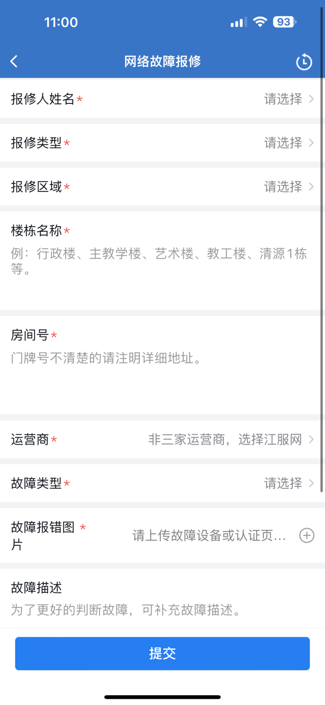 校园网络故障报修主要是面对全体师生的校园网登录或网络故障等问题,包括认证报错、光猫亮红灯、光猫不通电、没有网络信号等。具体报修流程如下:进入【企业微信】--【工作台】--【审批】--【网络故障报修】