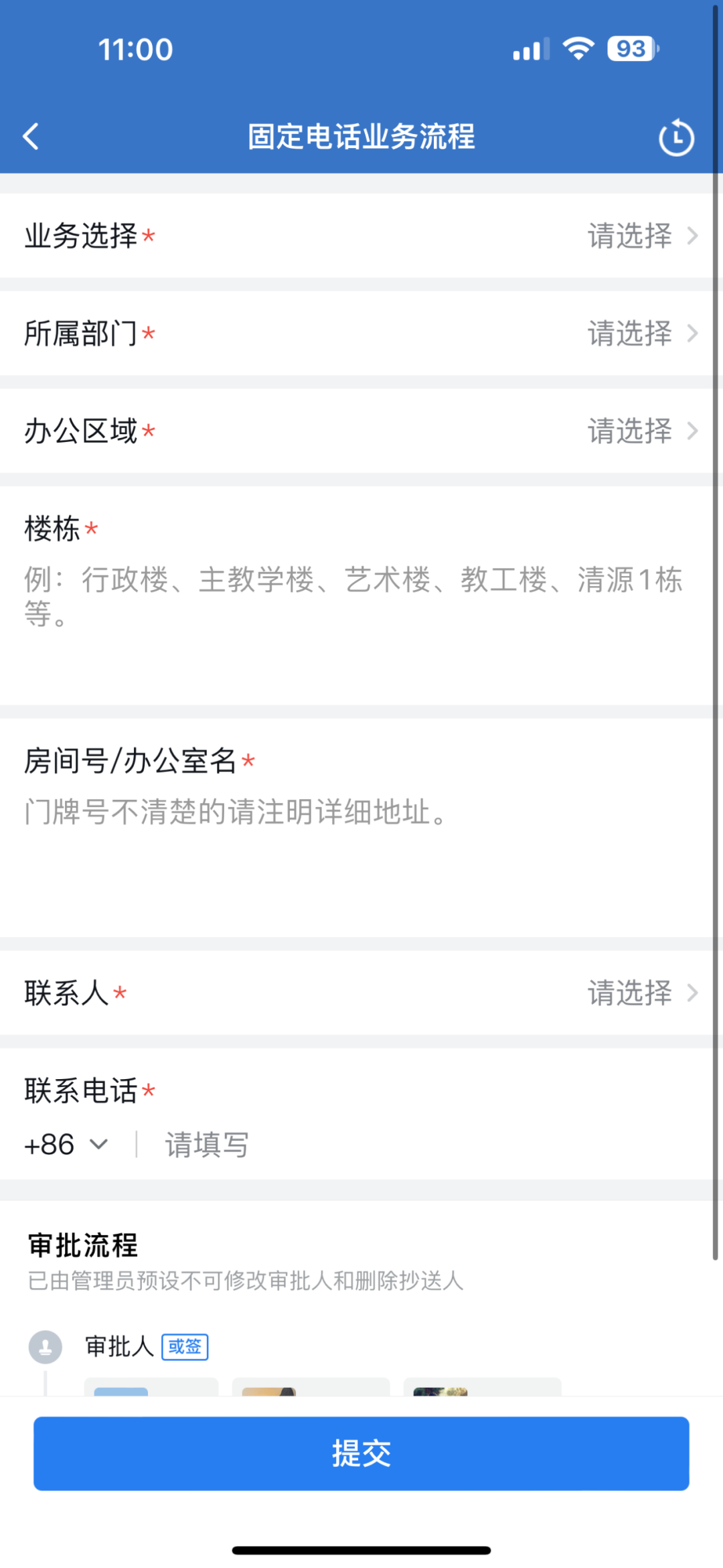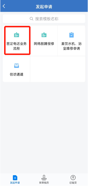 固定电话业务流程主要服务于校内教职工电话办公需求,如需申请或报修固话业务,具体操作如下:进入【企业微信】--【工作台】--【审批】--【固定电话业务流程】