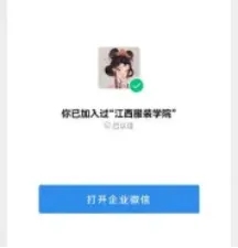 企业微信APP下载完成后,我们需要打开微信,扫描下方二维码,扫码后自动跳转点击【加入学校】加入江西服装学院企业微信。