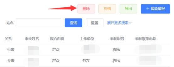 为减轻系统压力、提高数据质量,引导在校生填写相关信息,系统已添加好父亲和母亲记录。请各位同学根据实际情况填写家长姓名、家长政治面貌、家长工作单位、家长职务和家长联系电话等信息。如存在单亲家庭情况,可点击【删除】按钮进行删除。家庭成员相关信息填写后请前往【数据中心】=》【学生电子档案】查看。