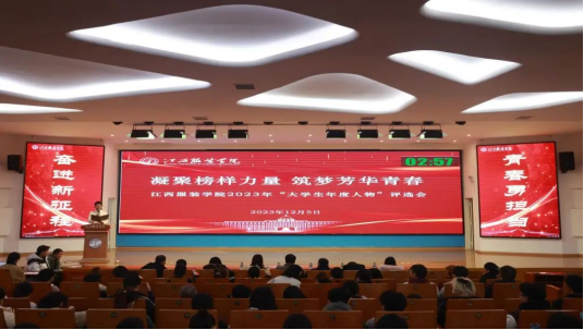 为深入学习宣传贯彻党的二十大精神与习近平新时代中国特色社会主义思想,落实立德树人根本任务,积极培育和践行社会主义核心价值观,激励广大江服学子怀抱梦想又脚踏实地,敢想敢为又善作善成,深入挖掘和大力宣传表彰先进、树立典型,集中展现江服学子的精神风貌,在全校范围内营造学习典型、争当先进的良好氛围,近日,我校在思贤楼三楼报告厅举行2023年“凝聚榜样力量 筑梦芳华青春”大学生年度人物评选活动。学生工作处处长邓良峰、副处长余晓萍、侯娜娜,各二级学院党委(党总支)书记(副)、全体辅导员及学生代表共400余人观摩。本次活动由校班长联合会职业能力发展中心主任沈国庆主持。