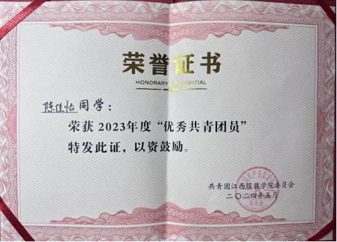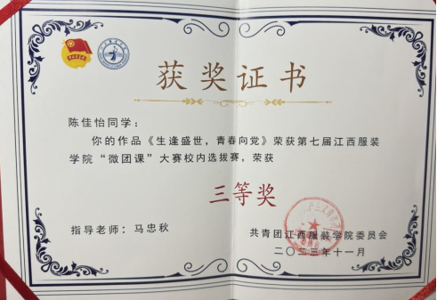 陈佳怡,女,汉族,2005年4月3日出生,共青团员。现就读于人文学院商务英语专业,江西服装学院第十期青马工程培训班学员。在校期间,她严格要求自己,表现出众,曾荣获“江西服装学院2023年度优秀共青团员”、“学雷锋优秀志愿者”等称号。在“微团课”大赛校赛中取得优异成绩,并代表学校参加市赛,取得了南昌市“微团课”大赛二等奖的好成绩。